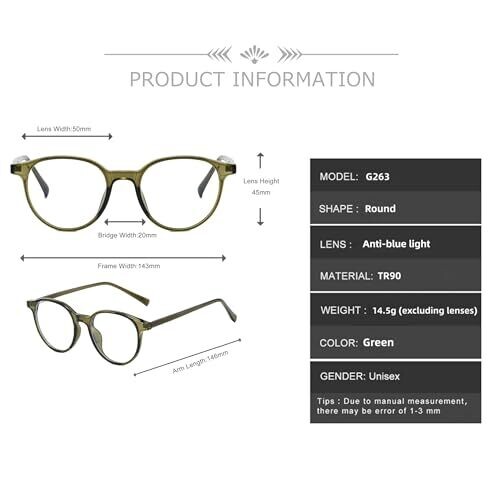 Classic glasses design suitable for most face shapes for both men and women. Durable frame with comfortable integrated nose pads and sturdy metal hinges. Lenses block harmful blue light and reduce eye strain; lenses can be replaced by a professional optometrist as needed. Product dimensions: