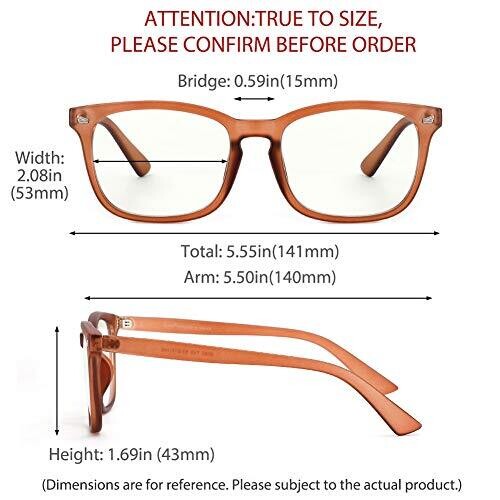 The lenses incorporate HEV-absorbed technology with a radiation protection membrane, an anti-reflective membrane, and a nano waterproof membrane. They absorb blue light in the 380 nm to 450 nm range while allowing beneficial blue light to pass through. The frames are lightweight polycarbonate square frames with PC lenses; PC lenses are approximately 30% lighter than resin lenses and 50% lighter than glass lenses, while offering higher impact resistance—reported as 60 times that of glass—based on standard tests. The eyewear is intended for both women and men and is suitable for use with computers, laptops, and smartphones to help mitigate computer visual strain symptoms such as reduced focus, blurred vision, fatigue, and related discomfort.