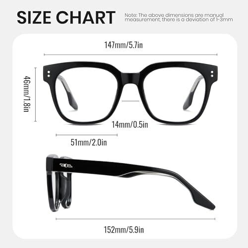 Large blue light glasses provide protection against blue light and UV rays, reducing eyestrain and headaches. The lenses are designed to filter out harmful blue light and UV rays. The frames are wide rectangular with durable material for comfort and longevity. The lenses are non-prescription and CE certified. Product dimensions include lens width 51 mm, lens height 46 mm, temple length 152 mm, and nose bridge 14 mm. The package includes a glasses case, a microfiber cleaning cloth, and a tool for blue light testing.
