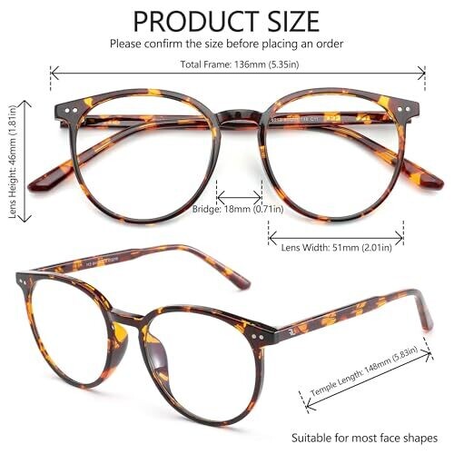 High quality lenses with UV400 protection. Clear lenses block blue light more effectively than standard lenses and are resistant to scratches and water. Interchangeable lenses allow replacement with prescription lenses at optical glasses stores. Frame material is TR90, lightweight, flexible, and durable. Product dimensions include:
