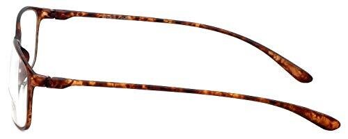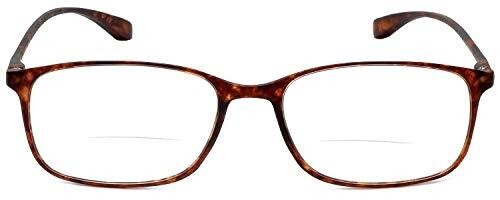 Calabria reading glasses in tortoise feature clear bi-focal lenses and a lightweight, flexible frame for comfort and durability. Switch between reading and distance easily, with a stylish design and protective hard case included.