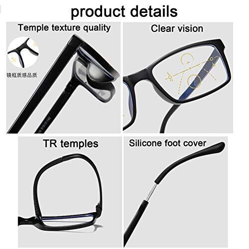 Progressive multi-focus reading glasses with gradual power transition for near and far vision. Anti-blue light and UV400 protection to help reduce eye fatigue and potential glare from screens. Ergonomic TR90 temples, adjustable spring hinges, integrated nose pads, and silicone foot caps for durability, flexibility, and comfort. Designed for all-day wear with a lightweight frame and durable construction.