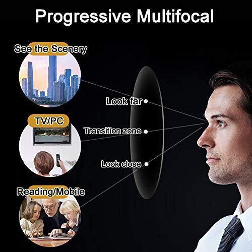 Progressive lenses provide clear vision from distance to near with smooth transitions. Anti-blue light coating reduces digital eye strain from screens, while UVA/UVB protection and glare reduction enhance comfort in varied lighting. Ergonomic, universal fit for men and women, with a protective case.