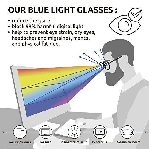 Reduces digital eye strain by filtering blue light from screens. Lightweight TR90 frame with transparent lenses for minimal color fringing. Unisex, versatile design for work, study, gaming, or reading. Includes cleaning cloth, protective pouch, and blue light protection test.