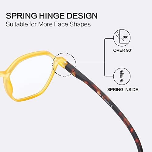 lenses are made of resin; frame design features a polygonal shape with spring hinges; surface coating is anti-greasy to facilitate cleaning.